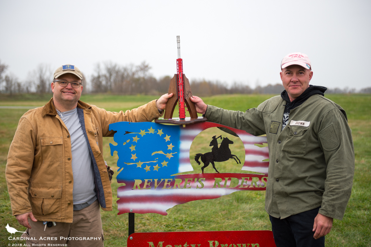 The 2nd Annual Marty Brown Rifle Match was held on Range 3 at Camp Atterbury Joint Maneuver Training Center over the weekend of Nov. 3-4, 2018. Fourteen participants brought their rifles in an attempt to win one of two trophies especially constructed for the event. The “High Score” and “Tactifail” trophies were custom made by Revere’s Riders instructor and volunteer Kevin Fitz-Gerald.